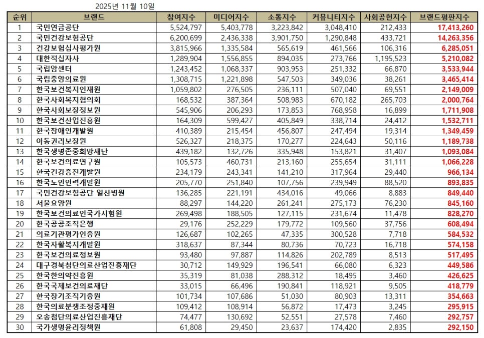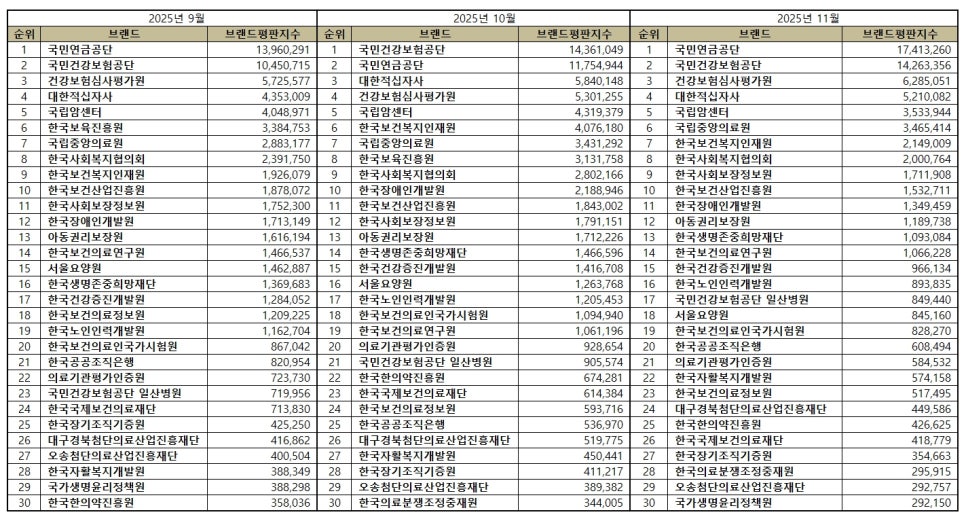 보건복지부 공공기관 브랜드평판 2025년 11월 빅데이터 분석결과, 1위 국민연금공단 2위 국민건강보험공단 3위 건강보험심사평가원 순으로 분석되었다.