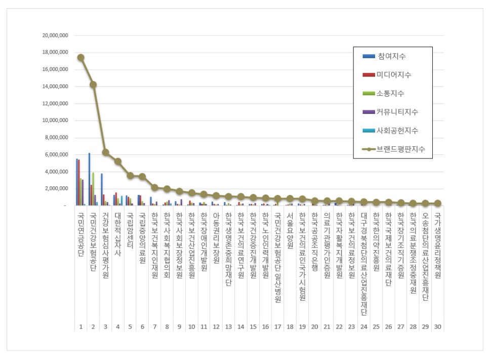 2025년 11월 보건복지부 공공기관 브랜드평판 순위는 국민연금공단, 국민건강보험공단, 건강보험심사평가원, 대한적십자사, 국립암센터, 국립중앙의료원, 한국보건복지인재원, 한국사회복지협의회, 한국사회보장정보원, 한국보건산업진흥원, 한국장애인개발원, 아동권리보장원, 한국생명존중희망재단, 한국보건의료연구원, 한국건강증진개발원, 한국노인인력개발원, 국민건강보험공단 일산병원, 서울요양원, 한국보건의료인국가시험원, 한국공공조직은행, 의료기관평가인증원, 한국자활복지개발원, 한국보건의료정보원, 대구경북첨단의료산업진흥재단, 한국한의약진흥원, 한국국제보건의료재단, 한국장기조직기증원, 한국의료분쟁조정중재원, 오송첨단의료산업진흥재단, 국가생명윤리정책원 순이었다.