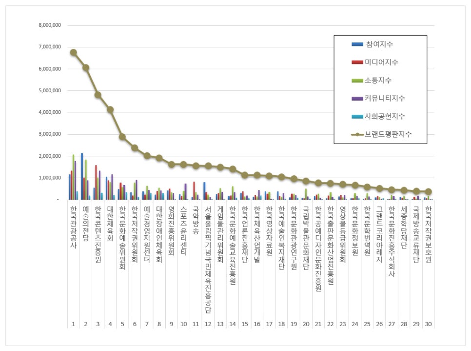 문화체육관광부 공공기관 브랜드평판 분석은 참여지수, 미디어지수, 소통지수, 커뮤니티지수, 사회공헌지수로 구분하여 브랜드평판지수를 산출하였다.