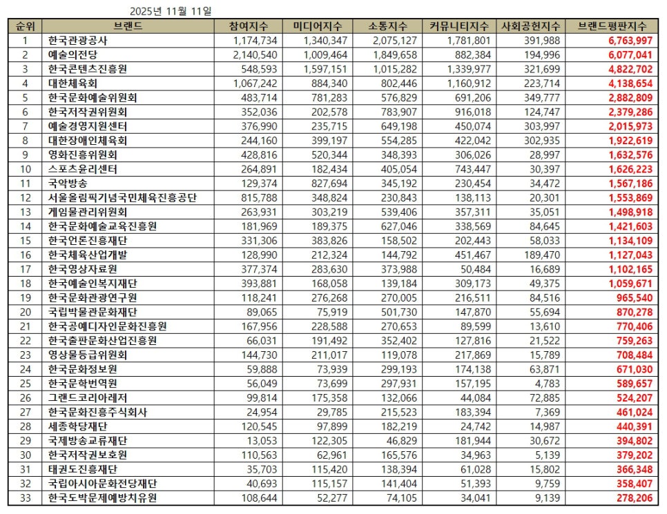 문화체육관광부 공공기관 브랜드평판 2025년 11월 빅데이터 분석결과, 1위 한국관광공사 2위 예술의전당 3위 한국콘텐츠진흥원 순으로 분석되었다.