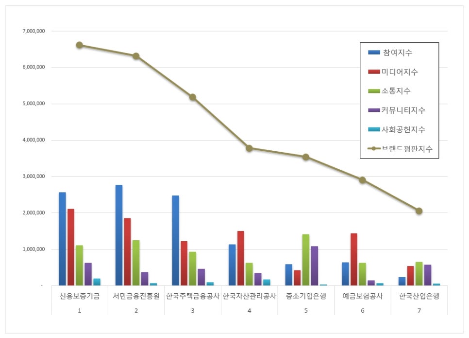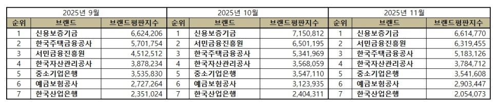 2025년 11월 금융위원회 공공기관 브랜드평판 순위는 신용보증기금, 서민금융진흥원, 한국주택금융공사, 한국자산관리공사, 중소기업은행, 예금보험공사, 한국산업은행 순이었다.