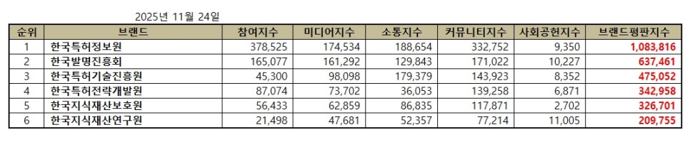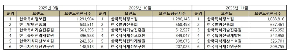 특허청 공공기관 브랜드평판 2025년 11월 빅데이터 분석결과, 1위 한국특허정보원 2위 한국발명진흥회 3위 한국특허기술진흥원 순으로 분석되었다.