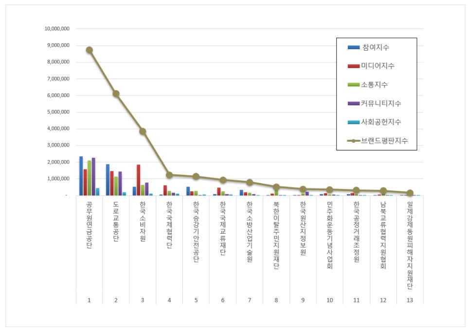 1위, 공무원연금공단 브랜드는 참여지수 2,338,308 미디어지수 1,588,613 소통지수 2,094,939 커뮤니티지수 2,279,615 사회공헌지수 445,680이 되면서 브랜드평판지수 8,747,155로 분석됐다. 지난 11월 브랜드평판지수 4,671,525와 비교해보면 87.24% 상승했다.