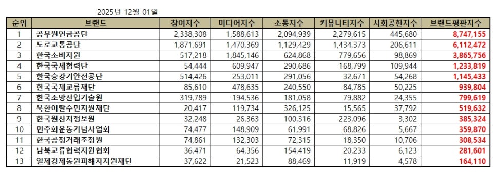 행정안전 공공기관 브랜드평판 2025년 12월 빅데이터 분석결과, 1위 공무원연금공단 2위 도로교통공단 3위 한국소비자원 순으로 분석되었다.