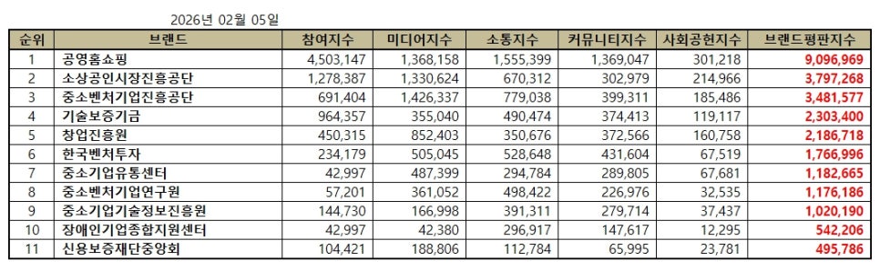 2026년 2월 중소벤처기업부 공공기관 브랜드평판 순위는 공영홈쇼핑, 소상공인시장진흥공단, 중소벤처기업진흥공단, 기술보증기금, 창업진흥원, 한국벤처투자, 중소기업유통센터, 중소벤처기업연구원, 중소기업기술정보진흥원, 장애인기업종합지원센터, 신용보증재단중앙회 순이었다.