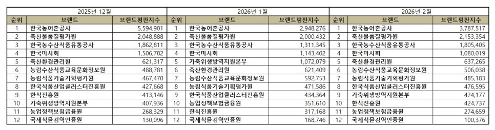 농림축산식품부 공공기관 브랜드평판 2026년 2월 빅데이터 분석결과, 1위 한국농어촌공사 2위 축산물품질평가원 3위 한국농수산식품유통공사 순으로 분석되었다.