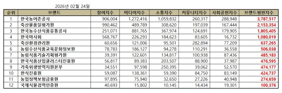 한국기업평판연구소 ( 소장 구창환 ) 는 국내 브랜드의 평판지수를 매달 측정하여 브랜드 평판지수의 변화량을 발표하고 있다. 2026년 2월 농림축산식품부 공공기관 브랜드평판지수는 2026년 1월 24일부터 2026년 2월 24일까지의 12개 농림축산식품부 공공기관 브랜드에 대한 빅데이터 분석 결과이다.