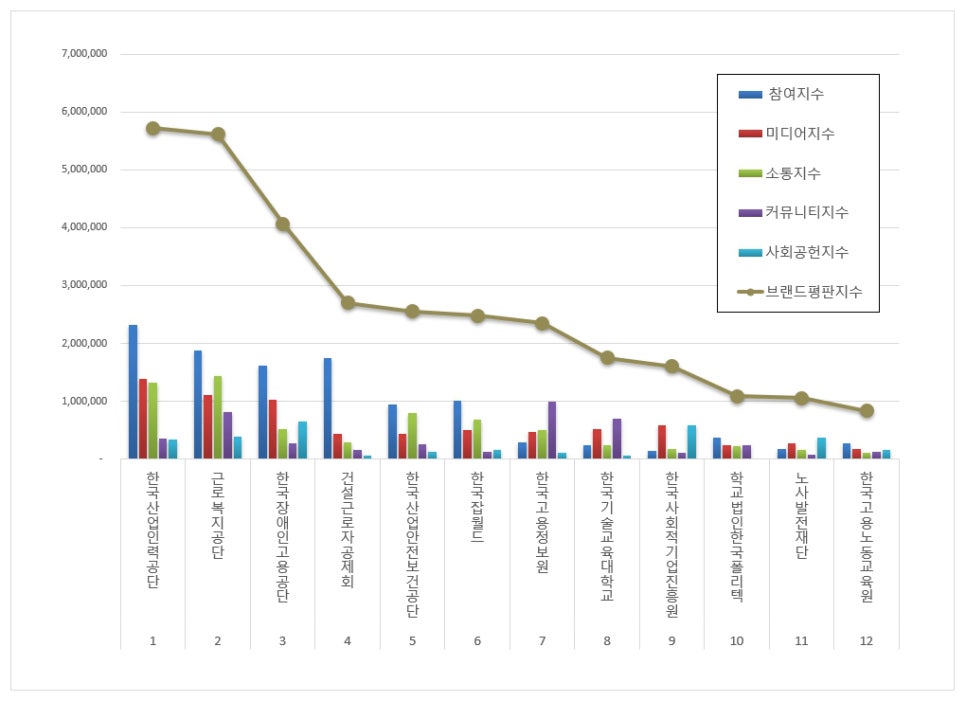 1위, 한국산업인력공단 브랜드는 참여지수 2,314,917 미디어지수 1,380,994 소통지수 1,320,138 커뮤니티지수 362,112 사회공헌지수 340,352가 되면서 브랜드평판지수 5,718,512로 분석됐다. 지난 12월 브랜드평판지수 4,164,695와 비교해보면 37.31% 상승했다.