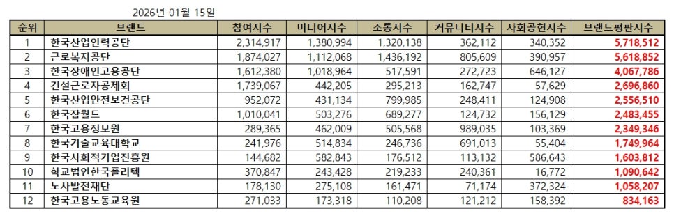 한국기업평판연구소 ( 소장 구창환 ) 는 국내 브랜드의 평판지수를 매달 측정하여 브랜드 평판지수의 변화량을 발표하고 있다. 2026년 1월 고용노동부 공공기관 브랜드평판지수는 2025년 12월 15일부터 2026년 1월 15일까지의 12개 고용노동부 공공기관 브랜드에 대한 빅데이터 분석 결과이다.