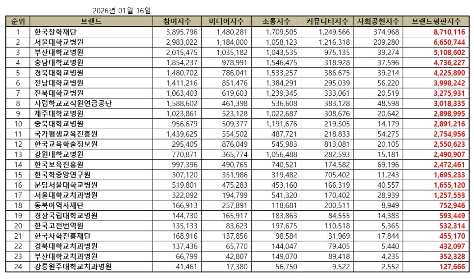 교육부 공공기관 브랜드평판 2026년 1월 빅데이터 분석결과, 1위 한국장학재단 2위 서울대학교병원 3위 부산대학교병원 순으로 분석되었다.