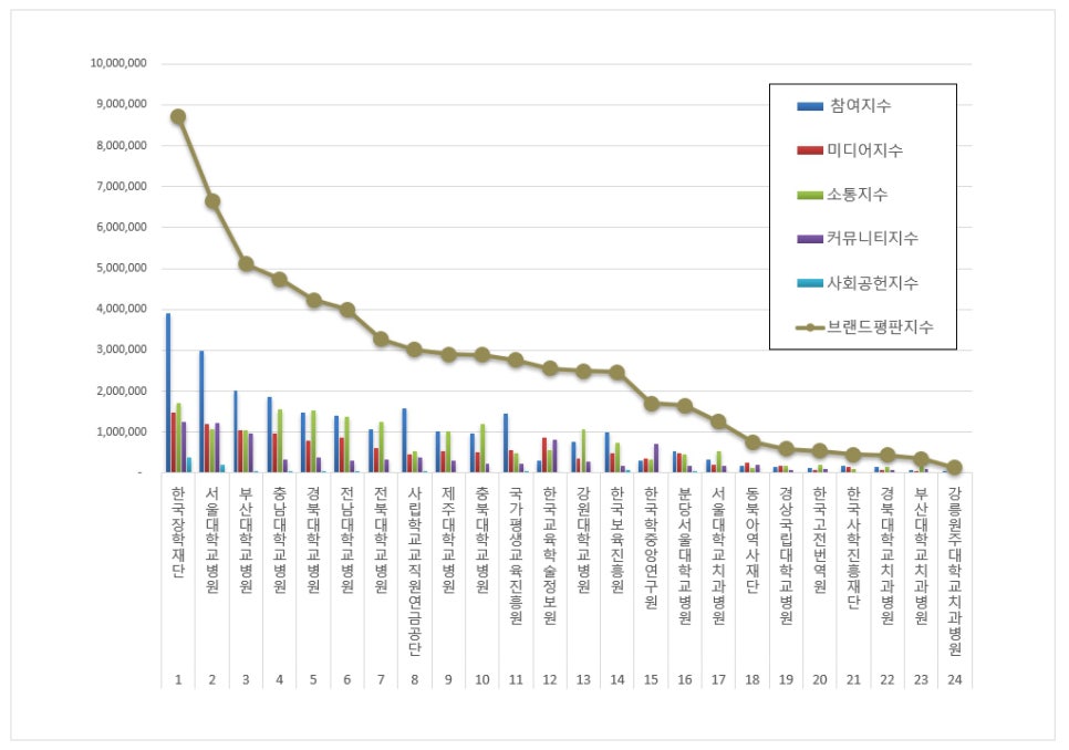 5위, 경북대학교병원 브랜드는 참여지수 1,480,702 미디어지수 786,041 소통지수 1,533,257 커뮤니티지수 386,675 사회공헌지수 39,214가 되면서 브랜드평판지수 4,225,890으로 분석됐다. 지난 12월 브랜드평판지수 4,230,261과 비교해보면 0.10% 하락했다.
