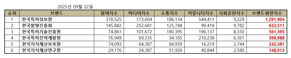 특허청 공공기관 브랜드평판 2025년 9월 빅데이터 분석결과, 1위 한국특허정보원 2위 한국발명진흥회 3위 한국특허기술진흥원 순으로 분석되었다.