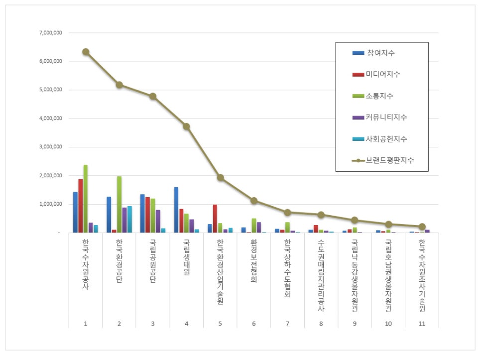 1위, 한국수자원공사 브랜드는 참여지수 1,439,625 미디어지수 1,878,753 소통지수 2,382,856 커뮤니티지수 361,638 사회공헌지수 279,518이 되면서 브랜드평판지수 6,342,389로 분석됐다. 지난 9월 브랜드평판지수 5,867,428과 비교해보면 8.09% 상승했다.