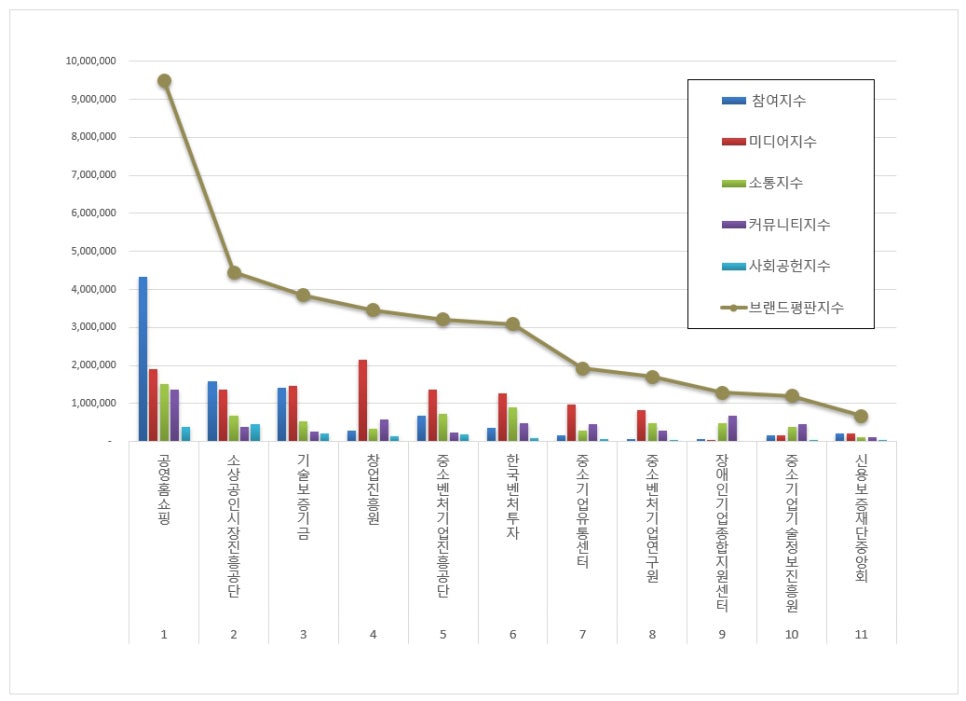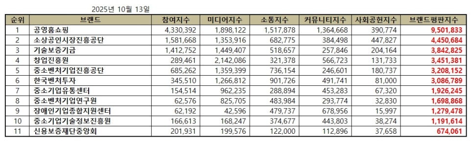 중소벤처기업부 공공기관 브랜드평판 2025년 10월 빅데이터 분석결과, 1위 공영홈쇼핑 2위 소상공인시장진흥공단 3위 기술보증기금 순으로 분석되었다.