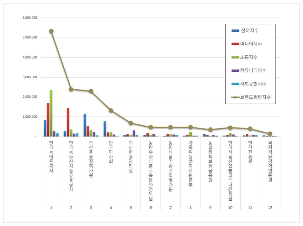 5위, 축산환경관리원 브랜드는 참여지수 74,093 미디어지수 120,219 소통지수 92,570 커뮤니티지수 323,404 사회공헌지수 71,263이 되면서 브랜드평판지수 681,549로 분석됐다. 지난 9월 브랜드평판지수 827,694와 비교해보면 17.66% 하락했다.