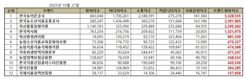 한국기업평판연구소 ( 소장 구창환 ) 는 국내 브랜드의 평판지수를 매달 측정하여 브랜드 평판지수의 변화량을 발표하고 있다. 2025년 10월 농림축산식품부 공공기관 브랜드평판지수는 2025년 9월 27일부터 2025년 10월 27일까지의 12개 농림축산식품부 공공기관 브랜드에 대한 빅데이터 분석 결과이다.