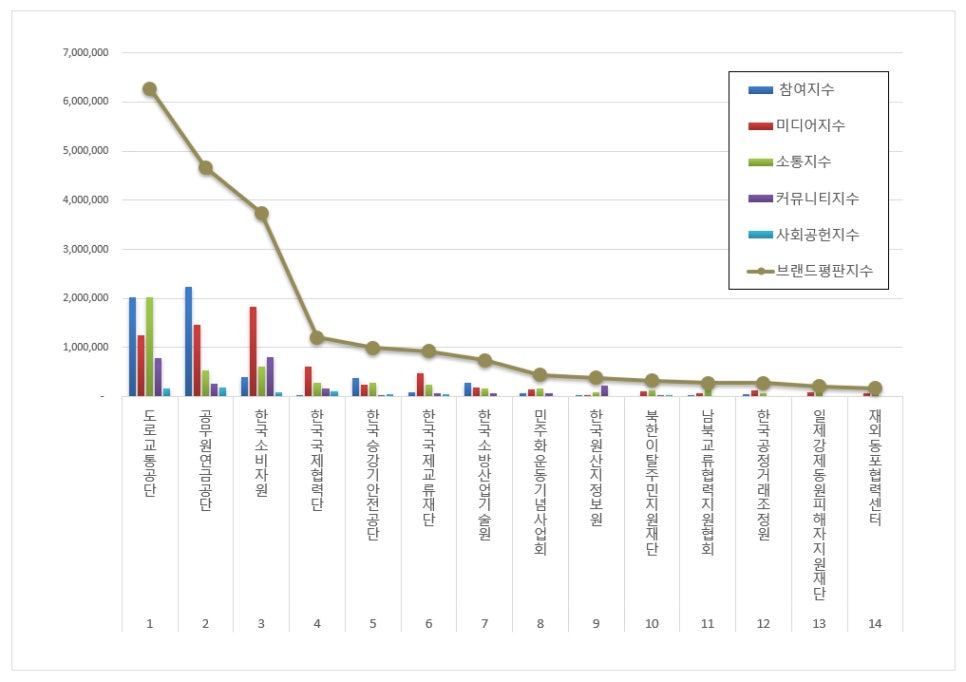 1위, 도로교통공단 브랜드는 참여지수 2,030,950 미디어지수 1,253,068 소통지수 2,019,246 커뮤니티지수 792,817 사회공헌지수 177,868이 되면서 브랜드평판지수 6,273,950으로 분석됐다. 지난 10월 브랜드평판지수 5,785,542와 비교해보면 8.44% 상승했다.