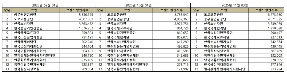 행정안전 공공기관 브랜드평판 2025년 11월 빅데이터 분석결과, 1위 도로교통공단 2위 공무원연금공단 3위 한국소비자원 순으로 분석되었다.
