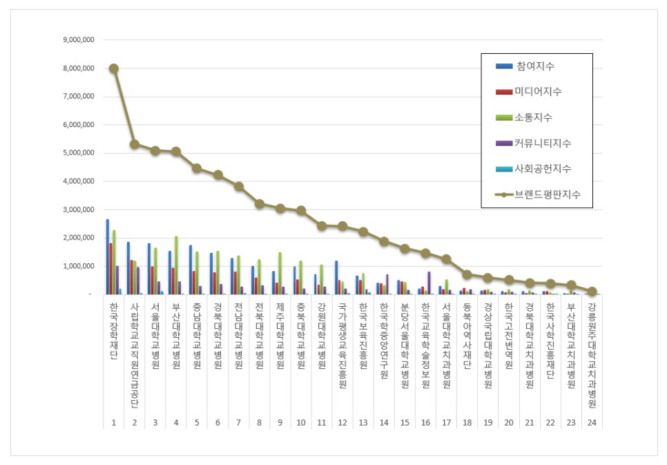 5위, 충남대학교병원 브랜드는 참여지수 1,746,745 미디어지수 840,762 소통지수 1,534,169 커뮤니티지수 309,643 사회공헌지수 36,250이 되면서 브랜드평판지수 4,467,568로 분석됐다. 지난 11월 브랜드평판지수 4,180,761과 비교해보면 6.86% 상승했다.