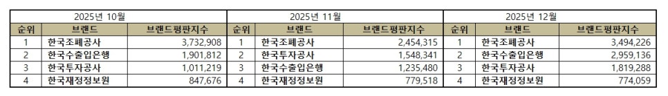기획재정부 공공기관 브랜드평판 2025년 12월 빅데이터 분석결과, 1위 한국조폐공사 2위 한국수출입은행 3위 한국투자공사순으로 분석되었다.