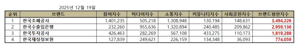 한국기업평판연구소 ( 소장 구창환 ) 는 국내 브랜드의 평판지수를 매달 측정하여 브랜드 평판지수의 변화량을 발표하고 있다. 2025년 12월 기획재정부 공공기관 브랜드평판지수는 2025년 11월 19일부터 2025년 12월 19일까지의 4개 기획재정부 공공기관 브랜드에 대한 빅데이터 분석 결과이다.