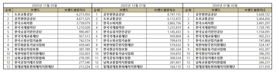 행정안전 공공기관 브랜드평판 2026년 1월 빅데이터 분석결과, 1위 공무원연금공단 2위 도로교통공단 3위 한국소비자원 순으로 분석되었다.