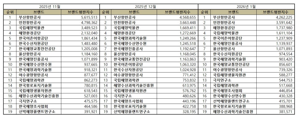 2026년 1월 해양수산부 공공기관 브랜드평판 순위는 부산항만공사, 인천항만공사, 해양환경공단, 국립해양박물관, 한국어촌어항공단, 한국해양진흥공사, 울산항만공사, 한국수산자원공단, 한국해양과학기술원, 한국해양교통안전공단, 여수광양항만공사, 국립해양생물자원관, 극지연구소, 국립해양과학관, 한국해양조사협회, 한국해양수산연수원, 선박해양플랜트연구소, 한국항로표지기술원, 해양수산과학기술진흥원 순이었다.