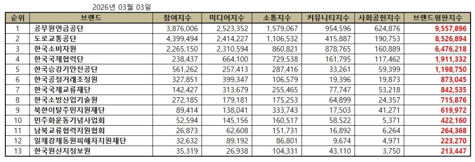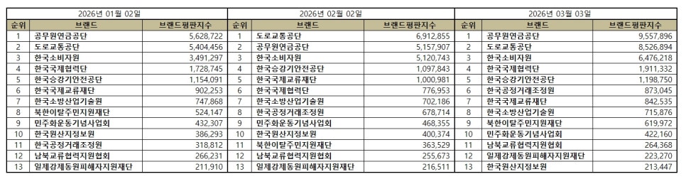 행정안전 공공기관 브랜드평판 2026년 3월 빅데이터 분석결과, 1위 공무원연금공단 2위 도로교통공단 3위 한국소비자원 순으로 분석되었다.