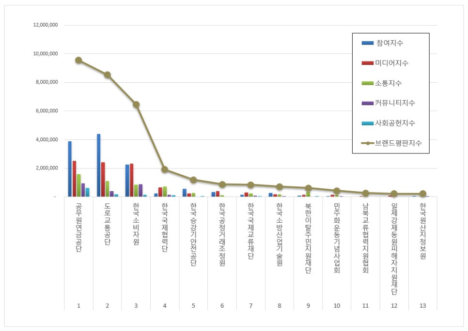1위, 공무원연금공단 브랜드는 참여지수 3,876,006 미디어지수 2,523,352 소통지수 1,579,067 커뮤니티지수 954,596 사회공헌지수 624,876이 되면서 브랜드평판지수 9,557,896으로 분석됐다. 지난 2월 브랜드평판지수 5,157,907과 비교해보면 85.31% 상승했다.