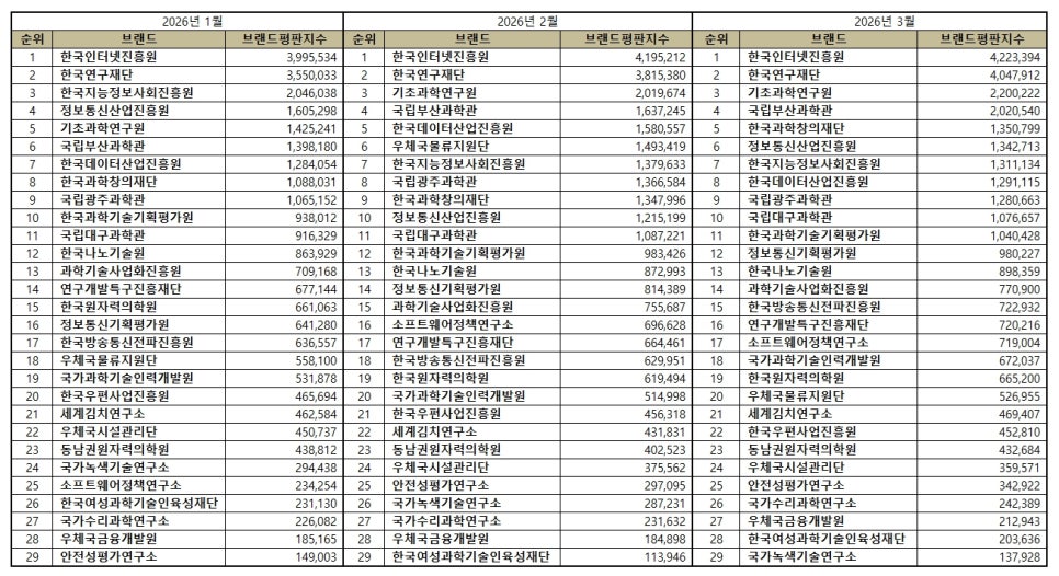과학기술정보통신부 공공기관 브랜드평판 2026년 3월 빅데이터 분석결과, 1위 한국인터넷진흥원 2위 한국연구재단 3위 기초과학연구원 순으로 분석되었다.