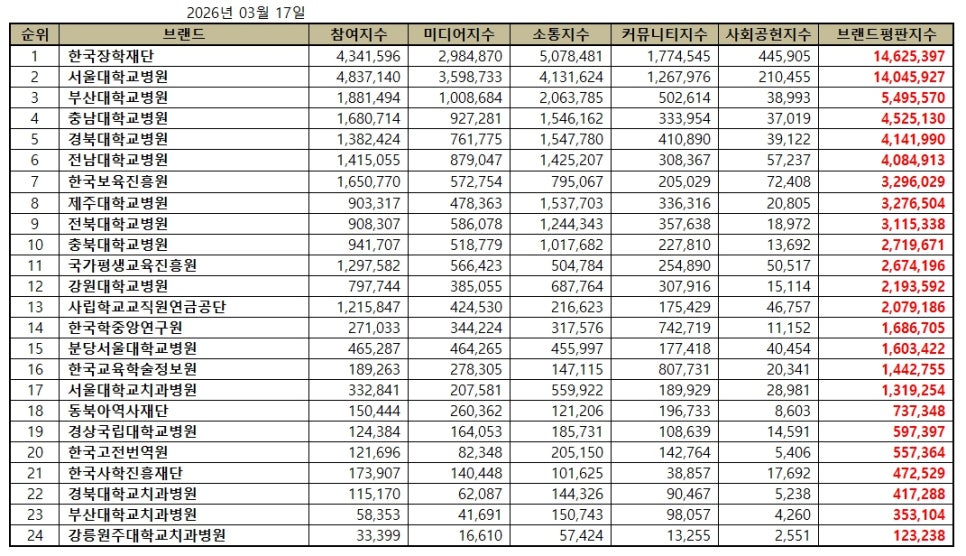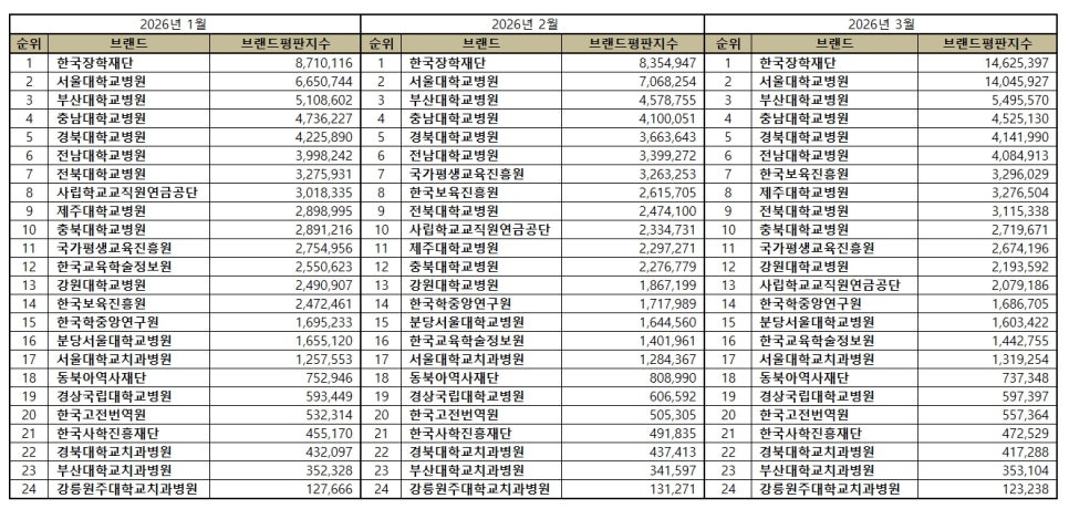 교육부 공공기관 브랜드평판 2026년 3월 빅데이터 분석결과, 1위 한국장학재단 2위 서울대학교병원 3위 부산대학교병원 순으로 분석되었다.