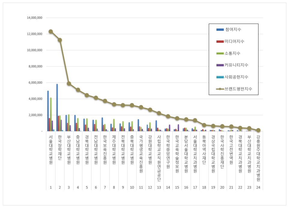 1위, 서울대학교병원 브랜드는 참여지수 4,990,700 미디어지수 1,636,034 소통지수 4,155,567 커뮤니티지수 1,332,194 사회공헌지수 214,845가 되면서 브랜드평판지수 12,329,340으로 분석됐다. 지난 3월 브랜드평판지수 14,045,927과 비교해보면 12.22% 하락했다.