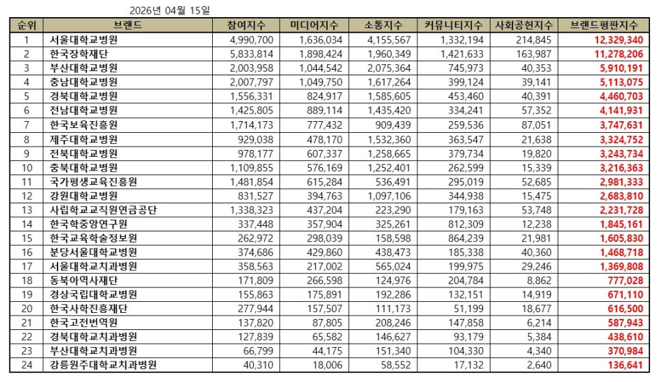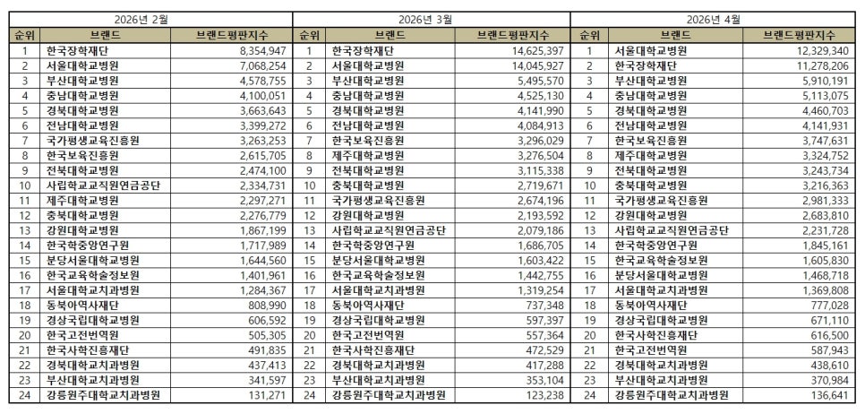 교육부 공공기관 브랜드평판 2026년 4월 빅데이터 분석결과, 1위 서울대학교병원 2위 한국장학재단 3위 부산대학교병원 순으로 분석되었다.