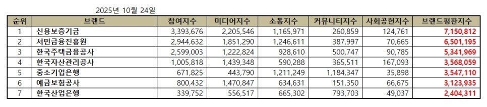 금융위원회 공공기관 브랜드평판 2025년 10월 빅데이터 분석결과, 1위 신용보증기금 2위 서민금융진흥원 3위 한국주택금융공사 순으로 분석되었다.