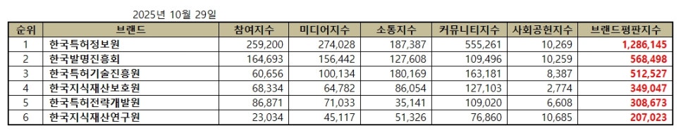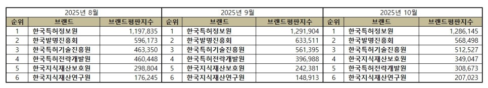 2025년 10월 특허청 공공기관 브랜드평판 순위는 한국특허정보원, 한국발명진흥회, 한국특허기술진흥원, 한국지식재산보호원, 한국특허전략개발원, 한국지식재산연구원 순이었다.