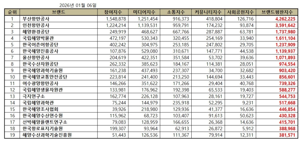 해양수산부 공공기관 브랜드평판 2026년 1월 빅데이터 분석결과, 1위 부산항만공사 2위 인천항만공사 3위 해양환경공단 순으로 분석되었다.