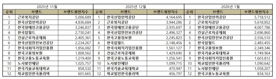 2026년 1월 고용노동부 공공기관 브랜드평판 순위는 한국산업인력공단, 근로복지공단, 한국장애인고용공단, 건설근로자공제회, 한국산업안전보건공단, 한국잡월드, 한국고용정보원, 한국기술교육대학교, 한국사회적기업진흥원, 학교법인한국폴리텍, 노사발전재단, 한국고용노동교육원 순이었다.