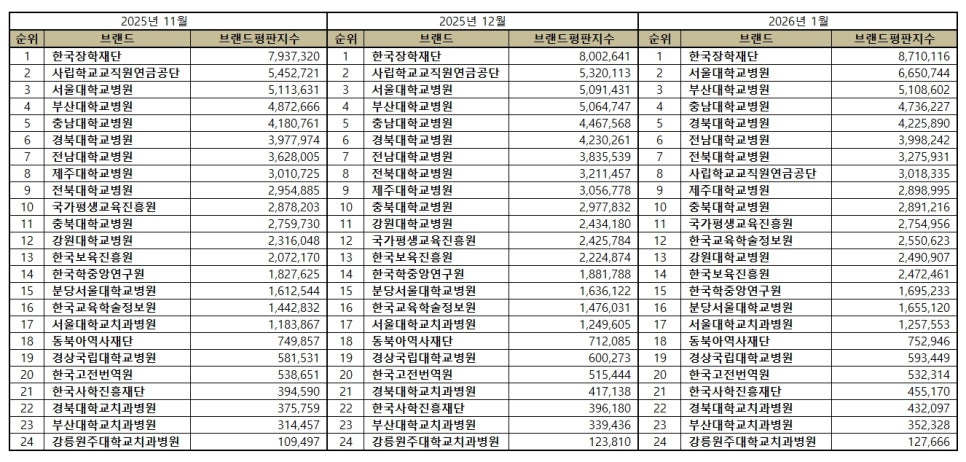 교육부 공공기관 브랜드평판 2026년 1월 빅데이터 분석결과, 1위 한국장학재단 2위 서울대학교병원 3위 부산대학교병원 순으로 분석되었다.