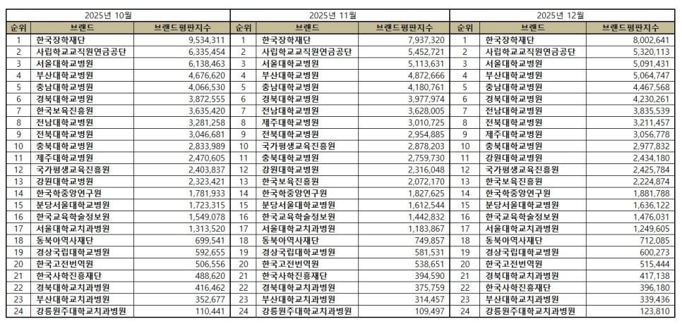 교육부 공공기관 브랜드평판 2025년 12월 빅데이터 분석결과, 1위 한국장학재단 2위 사립학교교직원연금공단 3위 서울대학교병원 순으로 분석되었다.