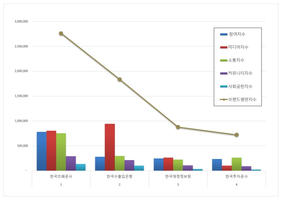 1위, 한국조폐공사 브랜드는 참여지수 783,156 미디어지수 803,788 소통지수 751,350 커뮤니티지수 291,148 사회공헌지수 134,511이 되면서 브랜드평판지수 2,763,953으로 분석됐다. 지난 8월 브랜드평판지수 2,885,243과 비교해보면 4.20% 하락했다.