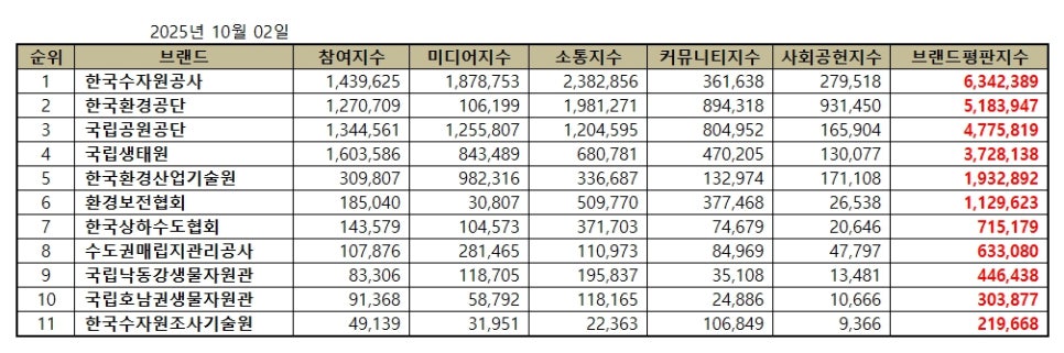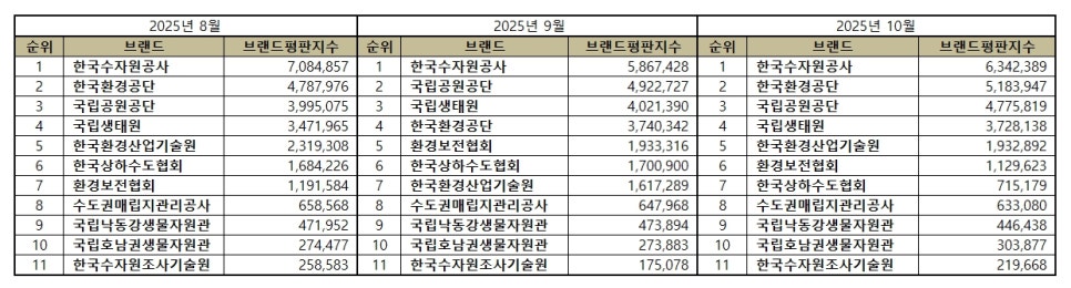 환경부 공공기관 브랜드평판 2025년 10월 빅데이터 분석결과, 1위 한국수자원공사 2위 한국환경공단 3위 국립공원공단 순으로 분석되었다.