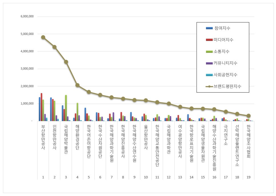 해양수산부 공공기관 브랜드평판 분석은 참여지수, 미디어지수, 소통지수, 커뮤니티지수, 사회공헌지수로 구분하여 브랜드평판지수를 산출하였다.
