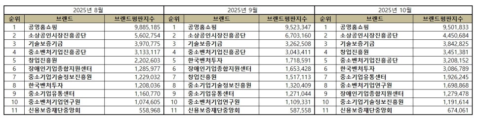 중소벤처기업부 공공기관 브랜드평판 2025년 10월 빅데이터 분석결과, 1위 공영홈쇼핑 2위 소상공인시장진흥공단 3위 기술보증기금 순으로 분석되었다.