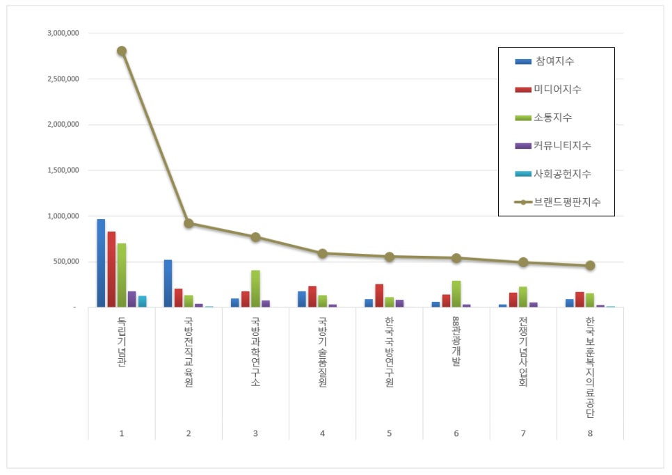 국방보훈 공공기관 브랜드평판 2026년 1월 빅데이터 분석결과, 1위 독립기념관 2위 국방전직교육원 3위 국방과학연구소 순으로 분석되었다.