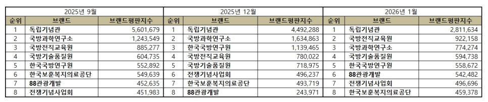 2026년 1월 국방보훈 공공기관 브랜드평판 순위는 독립기념관, 국방전직교육원, 국방과학연구소, 국방기술품질원, 한국국방연구원, 88관광개발, 전쟁기념사업회, 한국보훈복지의료공단 순이었다.