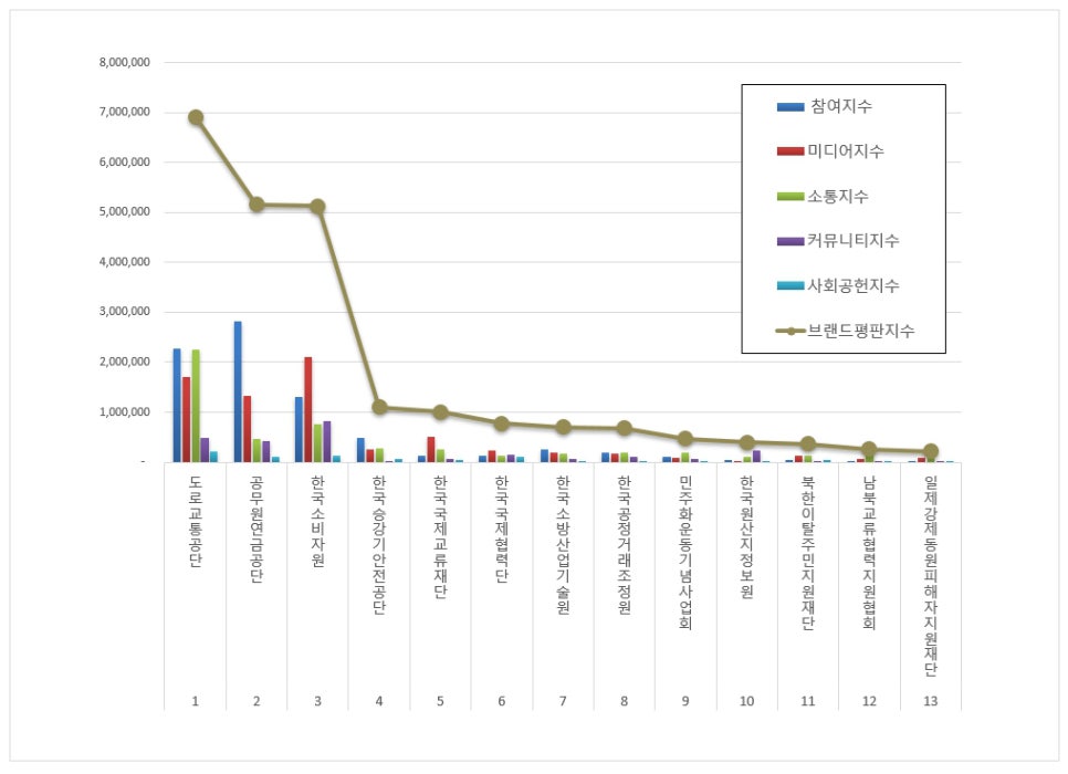 1위, 도로교통공단 브랜드는 참여지수 2,263,269 미디어지수 1,709,924 소통지수 2,260,559 커뮤니티지수 475,179 사회공헌지수 203,924가 되면서 브랜드평판지수 6,912,855로 분석됐다. 지난 1월 브랜드평판지수 5,404,456과 비교해보면 27.91% 상승했다.