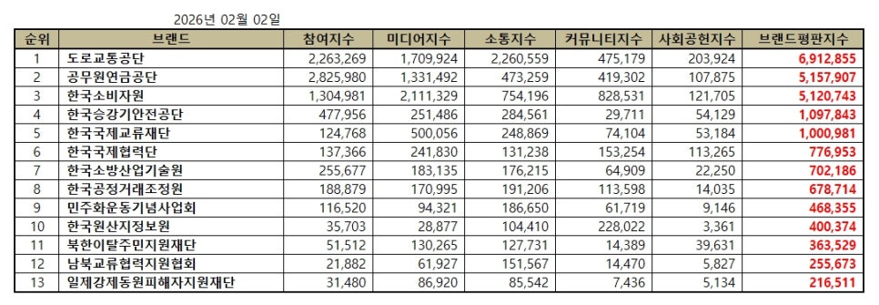 행정안전 공공기관 브랜드평판 2026년 2월 빅데이터 분석결과, 1위 도로교통공단 2위 공무원연금공단 3위 한국소비자원 순으로 분석되었다.