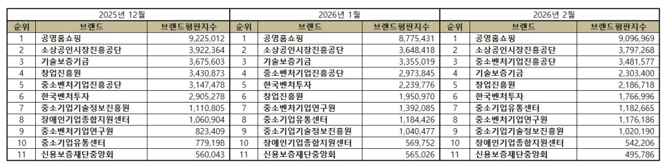 2026년 2월 중소벤처기업부 공공기관 브랜드평판 순위는 공영홈쇼핑, 소상공인시장진흥공단, 중소벤처기업진흥공단, 기술보증기금, 창업진흥원, 한국벤처투자, 중소기업유통센터, 중소벤처기업연구원, 중소기업기술정보진흥원, 장애인기업종합지원센터, 신용보증재단중앙회 순이었다.