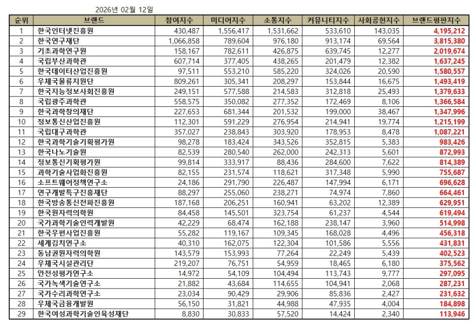 한국기업평판연구소 ( 소장 구창환 ) 는 국내 브랜드의 평판지수를 매달 측정하여 브랜드 평판지수의 변화량을 발표하고 있다. 2026년 2월 과학기술정보통신부 공공기관 브랜드평판지수는 2026년 1월 12일부터 2026년 2월 12일까지의 29개 과학기술정보통신부 공공기관 브랜드에 대한 빅데이터 분석 결과이다.