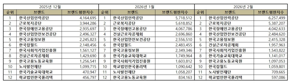 고용노동부 공공기관 브랜드평판 2026년 2월 빅데이터 분석결과, 1위 한국산업인력공단 2위 근로복지공단 3위 한국장애인고용공단 순으로 분석되었다.